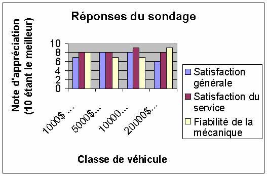 Le présent sondage à été effectué par une firme de consultant en marketing et nous fournis les résultats sur la satisfaction de clients de Autos D'occassion.